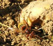 Шершень (Vespa crabro). Гнездо шершня (Vespa crabro) достигает 3 см длины. Материалом для строительства гнезда шершней служит кора молодых побегов деревьев, при этом, постройка получается не такая прочная, как у ос. Поэтому, свое гнездо ему приходится располагать в более надежных укрытиях, например, в старых пнях или дуплах деревьев, где они сидят на поверхности, охраняя вход в гнездо. Иногда такое гнездо к осени может разрастись до размеров ведра.